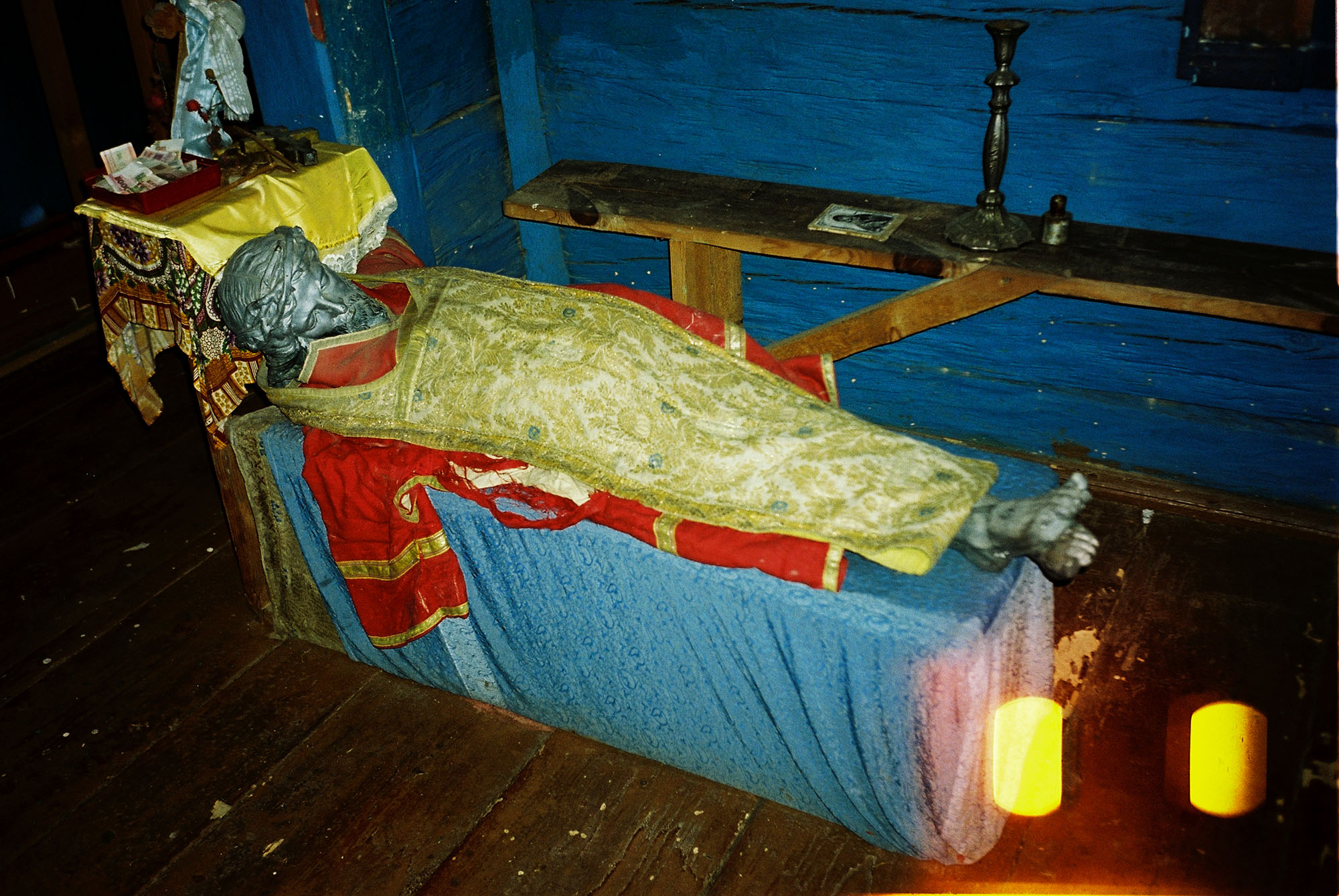 – З тваёй кнігі я часта згадваю ляжачага, пакрытага рознымі хусткамі Хрыста з царквы Святога Георгія ў вёсцы Сінкевічы – драўляную скульптуру. Нагадай, калі ласка, калі яго выносяць да людзей?
