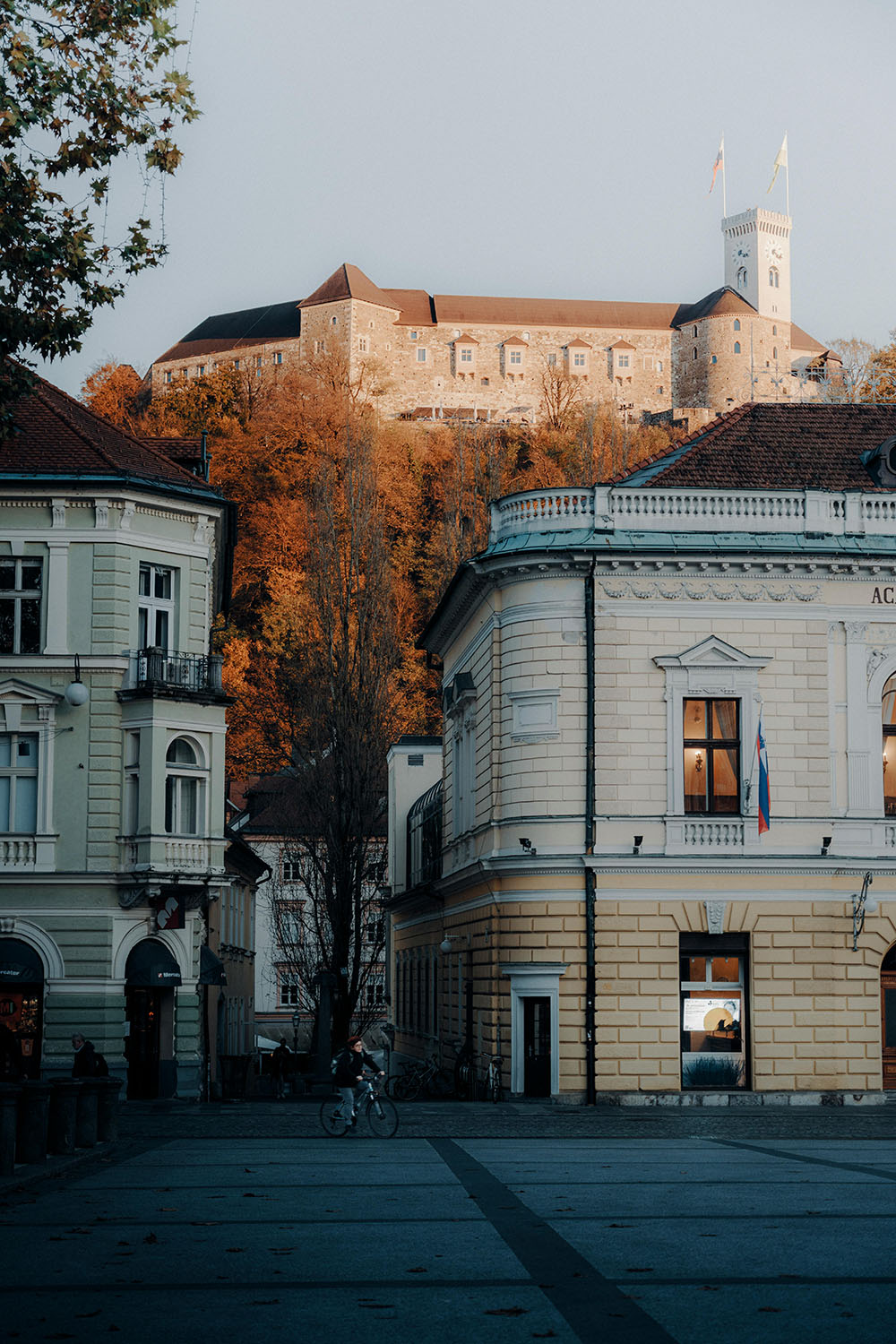 По дороге обратно в центр обязательно поднимись на вершину холма к Люблянскому замку (Ljubljanski grad / Google Maps). Забраться туда можно за € 3,30 и 4 минуты на фуникулере (Vzpenjača na Ljubljanski grad / Сайт / Google Maps) или бесплатно пешком через лес за 20 минут. Сверху открывается прекрасный вид на город – можешь вернуться сюда в винотеку на закате. Зайти в замковый двор можно бесплатно, а для посещения самого здания уже придется купить билет (€ 17 при покупке онлайн). Об истории города можно узнать не только в традиционном музее, но и в игровом формате в квест-руме (Сайт): если быстро сориентируешься в истории Любляны, то спасешь знаменитого дракона. Игру лучше бронировать, стоимость – € 23 человека вместе с билетом на фуникулер.
