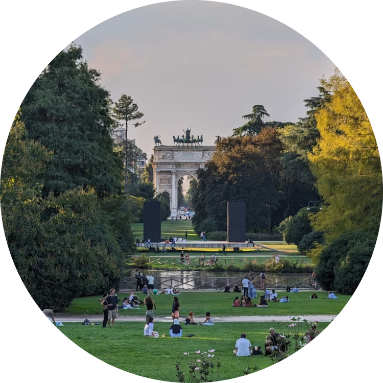 Прямо за замком раскинулся просторный ландшафтный парк Семпионе (Parco Sempione / Google Maps). Если пройдешь его насквозь, выйдешь прямо к мраморной Арке Мира (Arco della Pace / Google Maps – Piazza Sempione) с колоннами, рельефами и колесницей с шестеркой лошадей. По размерам она поскромнее парижской Триумфальной арки, но тоже была спроектирована по заказу Наполеона (но в итоге построена позже и уже под другим названием).