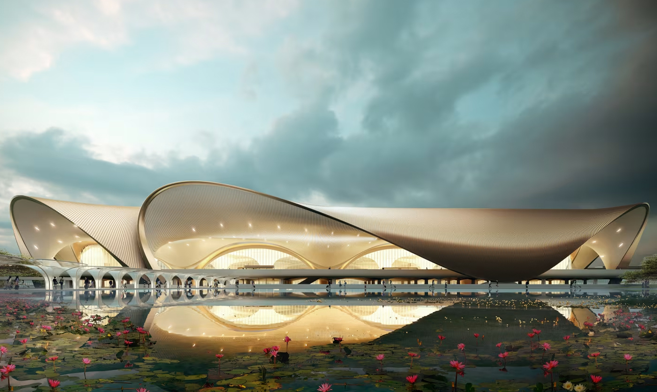 Проект разработан бюро Zaha Hadid Architects. Терминал, выполненный в форме лотоса, объединяет современные архитектурные решения с традиционными индийскими мотивами. В здании используется альтернативная энергия, предусмотрены системы естественного охлаждения и водоочистки.