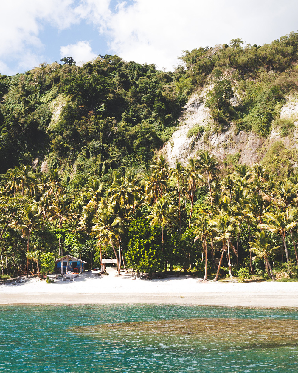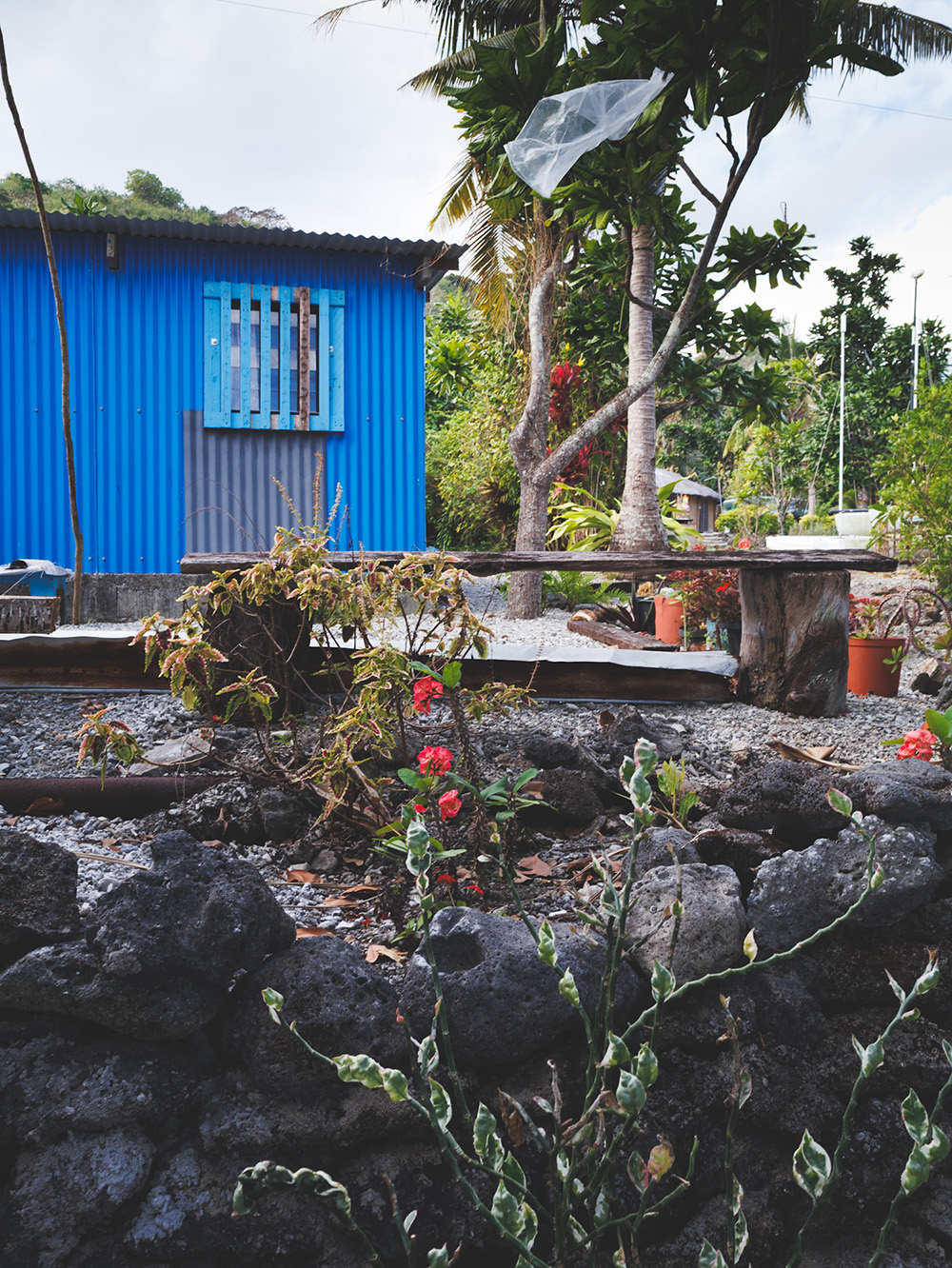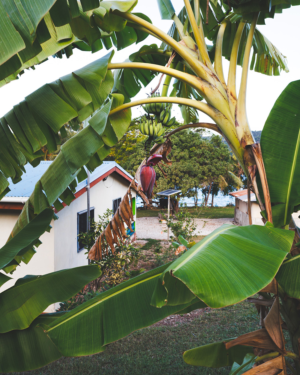 В ветреный солнечный день на небольшой моторной лодке мы отправляемся на остров Пеле (Pele / Google Maps), на север от Эфате. На острове живет около 500 человек в маленьких ярких домиках в тени длинных пальм. Туристам предлагается home stay – комната или домик целиком и завтрак, обед и ужин из простых местных продуктов и фруктов. Такого жилья не найти на Booking или Airbnb – нужно договариваться на месте или заранее выбрать что-то вот здесь. В деревне есть солнечные панели и импровизированный водопровод на дождевой воде.