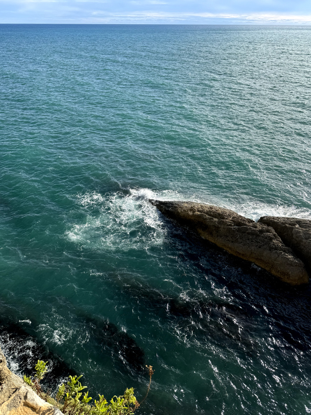 Спустя минут 15 от старта трейла дорога выходит на крупные валуны с выходом к морю. Везде – удивительно прозрачная вода. Тут стоят несколько рыбаков, а кто-то просто отдыхает – с книжками и без. Если пройти чуть дальше, можно дойти до пляжа недалеко от большого заброшенного отеля и искупаться.