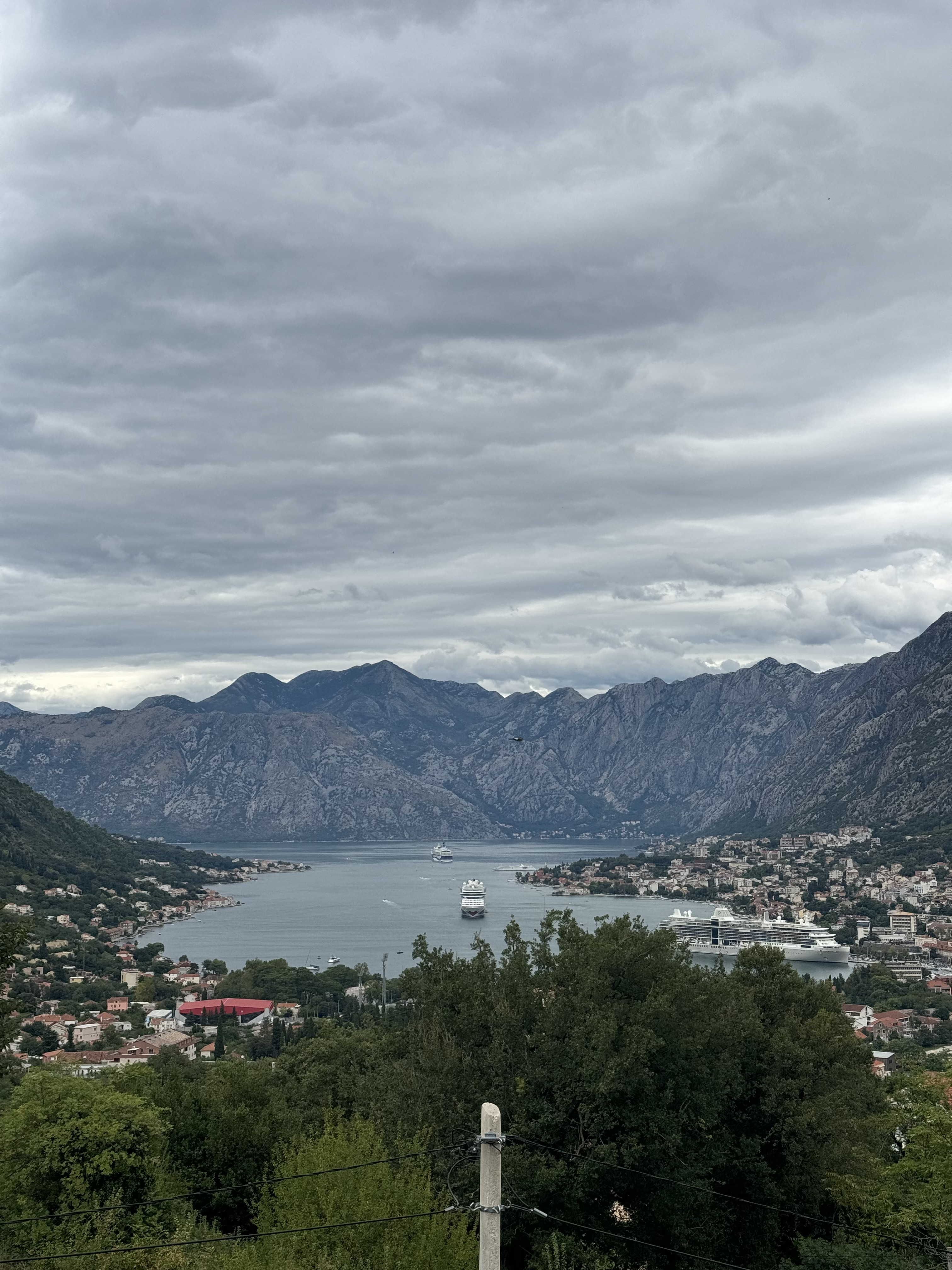 Весь серпантин – это подъем выше над бухтой Котора. Виды тут просто захватывающие! Остановиться захочется чуть ли не каждые сто метров: чтобы рассмотреть, как просыпается город, а если повезет – увидеть как в бухту заезжают большие круизные лайнеры.