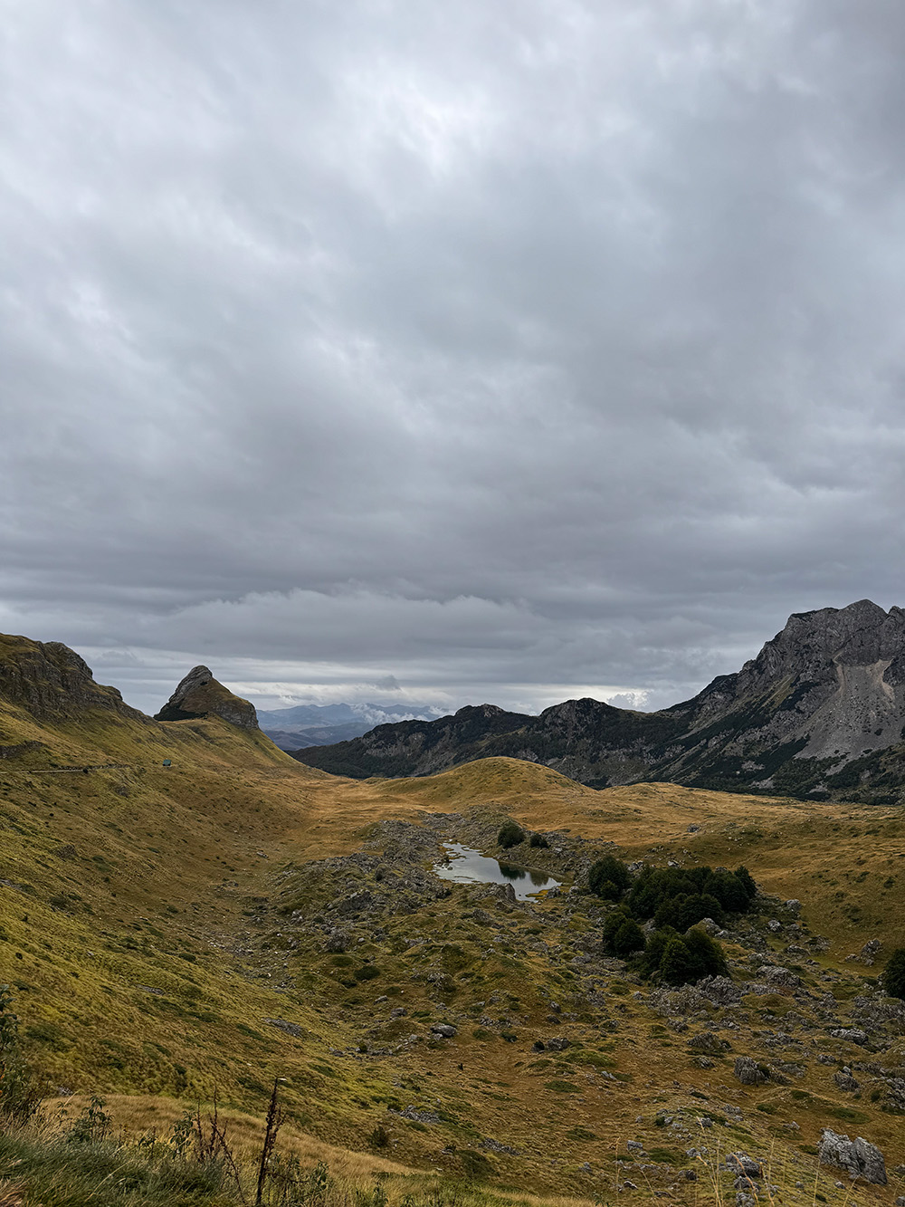 Набравшись впечатлений, мы выехали в сторону национального парка Дурмитор (Durmitor / Google Maps). Дорога P14, которая через него проходит, была самой красивой во всем путешествии, даже в непогоду. Тут, наверное, не хватит никаких слов и фотографий, чтобы описать, как желтеющие горные склоны скрывали свои вершины в динамичных облаках. Умиротворение и большое удовольствие!