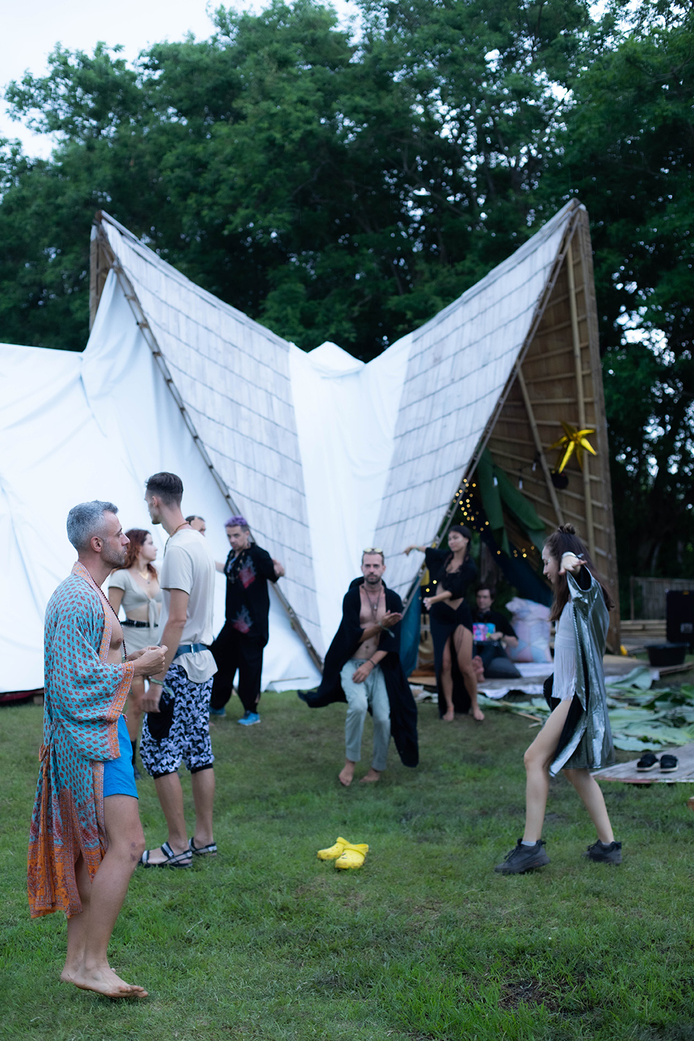 У нас не было материалов для постройки командной кухни и настила полов от дождя, собранные деньги кончились, времени почти не осталось. Мы увидели рядом с площадкой в джунглях остатки какой-то заброшенной конструкции и притащили оттуда два высоких барных стола, каркасы для пола и несколько крепких скамеек. Получилась отличная кухня, зона отдыха и стойка гриттеров, встречающих гостей. В день открытия у нас были готовы две локации: одна для индивидуальных практик, вторая для групповых сессий саунд-хилинга, медитаций, музыкальных джемов, чайных церемоний и танцевальных опытов.