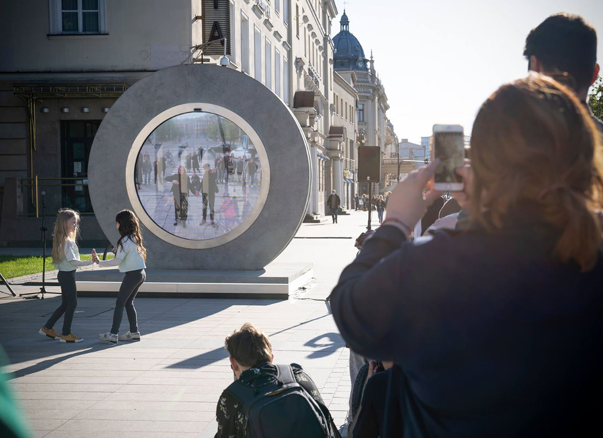 Проект, на реализацию которого ушло 5 лет. Теперь жители Вильнюса и Люблина в реальном времени могут помахать друг другу рукой – настоящий портал будущего. Работает это так: на круглый экран транслируется происходящее в каждом из двух городов. В любой момент можно подойти к экрану и посмотреть, что происходит в городе, расположенном в 600 километрах отсюда.