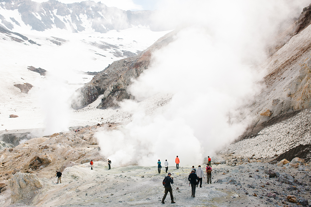 Восхождение на Горелый считается одним из самых легких. Об этом я узнала после двухчасового подъема, когда, тяжело дыша и вытирая пот со лба, добралась до вершины. На Мутновский мы поднимались часов шесть, проваливаясь то в снег, то в песок. На середине пути вдруг выяснилось, что можно было срезать, подъехав на автобусе прямо к подножию вулкана. Это был какой-то переломный момент, испытание на выносливость, которое нельзя было не пройти, потому что оказавшись in the middle of nowhere, ты просто не можешь повернуть назад. Невзирая на боль и промокшие насквозь ноги, ругаясь от усталости и злости, продолжаешь идти вперед. Из-за того, что мы потратили в общей сложности часов десять на восхождение и спуск, времени на сам вулкан осталось совсем немного. Тем не менее, мы как завороженные бродили по кальдерам, периодически исчезая в облаках сероводорода.