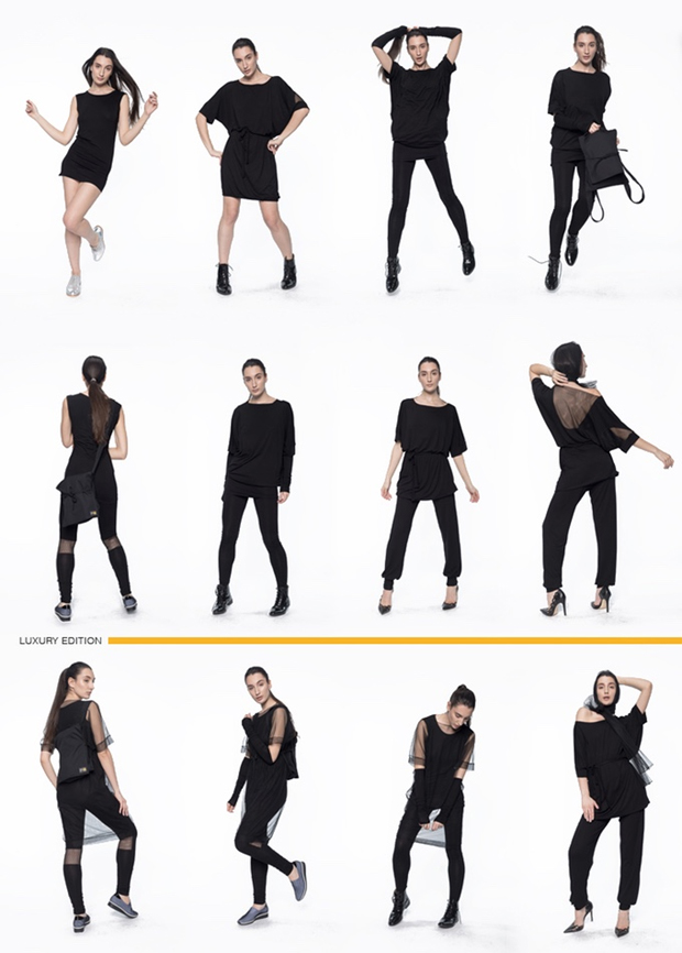 В комплект входят платье, дополнительные длинные рукава к нему, пояс, шапка и шарф, длинная туника без рукавов, леггинсы и брюки. Вместе все предметы складываются в миниатюрный рюкзак и весят 1,7 кг. Набор поставляется в одном цвете, поэтому все вещи отлично сочетаются между собой. На улицах Загреба или Лондона никто не догадается, что все эти наряды упакованы в одну маленькую сумку.