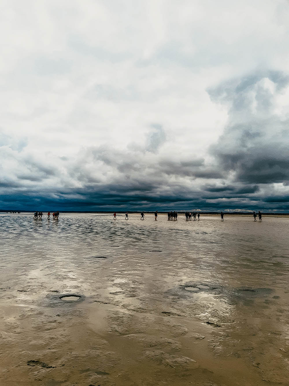 Мон-Сен-Мишель – это остров-крепость с одноименным аббатством посреди моря, со всех сторон окруженный водой и много веков назад совсем неприступный. Сейчас туда можно добраться цивилизованным путем по мосту с материка, откуда также ходят специальные туристические шаттлы, и более экзотическим – босиком по песчаному дну с Жене или Сен-Леонарда, когда море отступит, ведь там самые большие приливы в континентальной Европе. Пересечение залива длится около 3 часов в одну сторону и возможно только с организованной группой, идти в одиночку строго запрещено. Везде на побережье расположены стенды с информацией про время приливов и предупреждениями о всевозможных опасностях, которые таятся в море. А их действительно много: начиная от самих приливов (со скоростью около 7 км/час и высотой до 15 метров), которые могут застать незадачливого путешественника врасплох, и заканчивая пересечением русла двух рек на пути и участками с болотисто-зыбучими песками. Одним словом, жизнью лучше зря не рисковать и заплатить € 12 профессиональному гиду.
