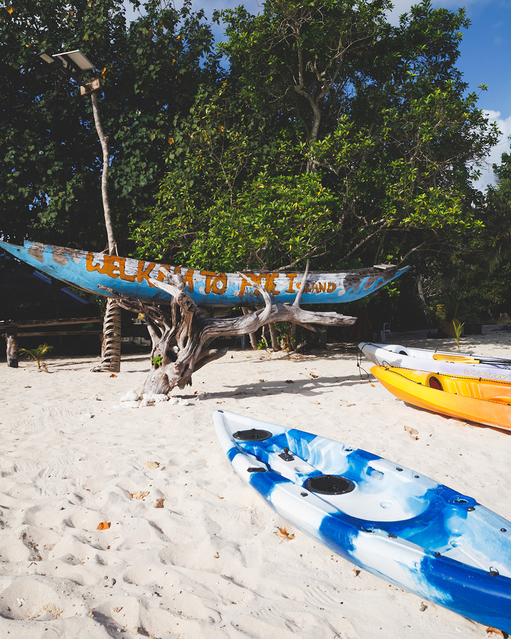 Как раз с таким водителем мы доехали до переправы на Hideaway Island (Google Maps). Этот остров совсем крошечный, без постоянных жителей. Здесь есть только парочка бунгало для туристов, пляж, кафе, прокат масок и ласт и главная достопримечательность – подводное почтовое отделение. Отсюда можно отправить специальную непромокаемую открытку в любую страну мира, но чтобы опустить ее в почтовый ящик, придется нырнуть на пару метров под воду. Наши открытки добрались в Минск спустя два месяца.