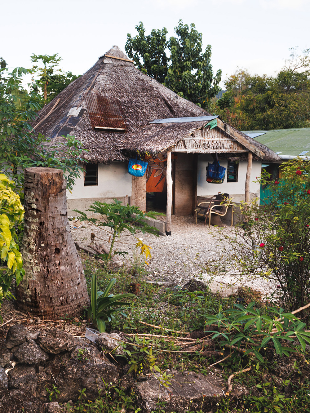 В ветреный солнечный день на небольшой моторной лодке мы отправляемся на остров Пеле (Pele / Google Maps), на север от Эфате. На острове живет около 500 человек в маленьких ярких домиках в тени длинных пальм. Туристам предлагается home stay – комната или домик целиком и завтрак, обед и ужин из простых местных продуктов и фруктов. Такого жилья не найти на Booking или Airbnb – нужно договариваться на месте или заранее выбрать что-то вот здесь. В деревне есть солнечные панели и импровизированный водопровод на дождевой воде.
